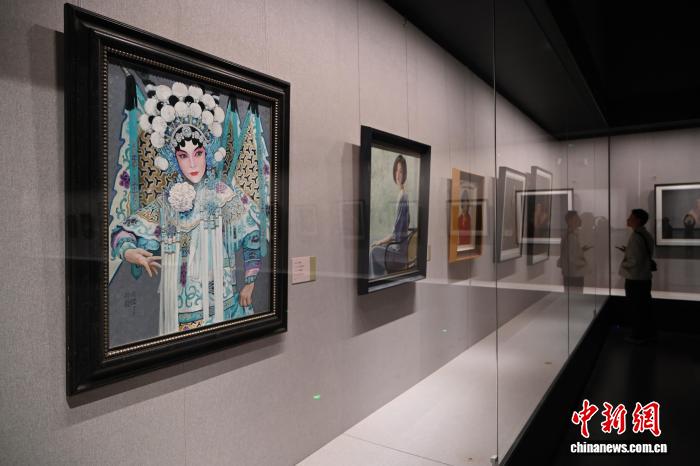 靳尚谊油画作品展出,左一为布面油画作品《杨门女将》。中新网记者 刘文采 摄