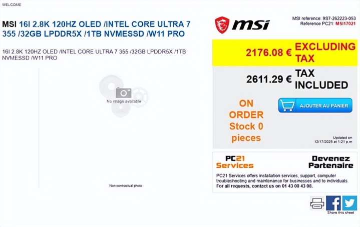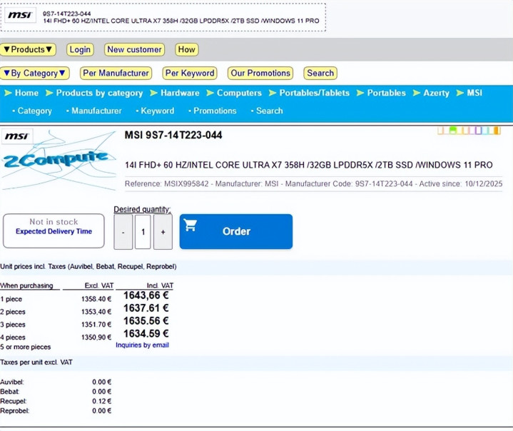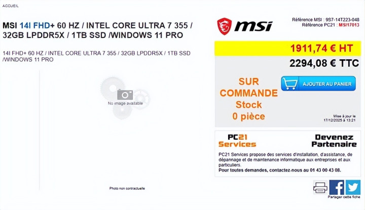 微星多款Panther Lake条记本则在欧洲零卖商,如法国PC21和比利时2Compute现身,其中一款搭载酷睿Ultra 7 355,配备32GB内存和1TB SSD,14英寸版起售价约为2294欧元,16英寸2.8K OLED版则高达2611欧元。