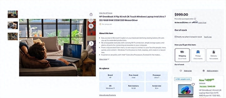 在沃尔玛的在线商城中,列出了一款惠普OmniBook X Flip 16,标价为999好意思元(约东说念主民币7033元)。