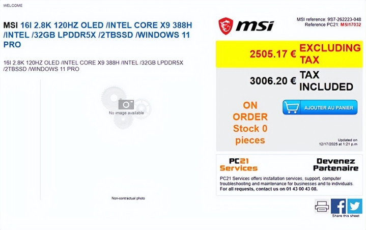 还有一款配备旗舰级酷睿Ultra X9 388H责罚器的微星条记本,搭载32GB内存、2TB SSD和2.8K 120Hz OLED默契屏,这款条记本电脑在PC21上标价约3006欧元。