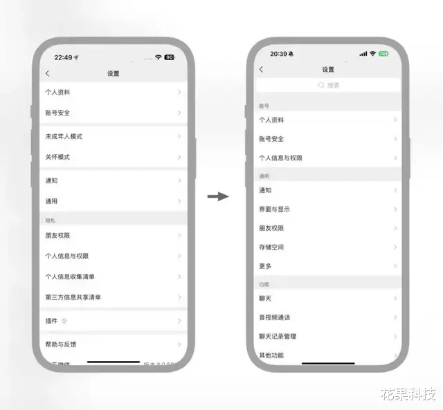 不仅在顶部加入了搜索框,况且所有界面的选项分区和排序也愈加直不雅,不错更快速找到我方需要果然立样子。